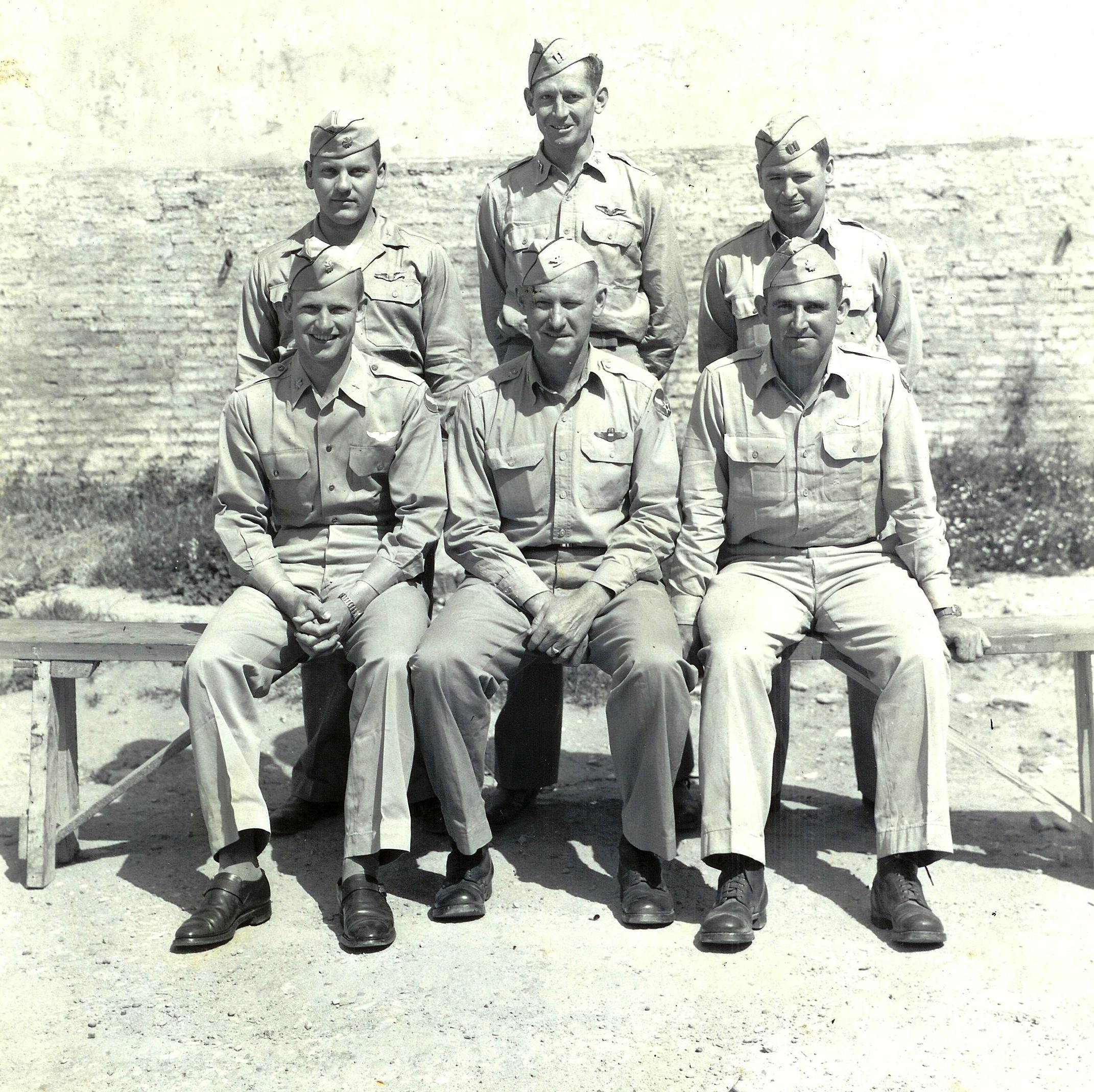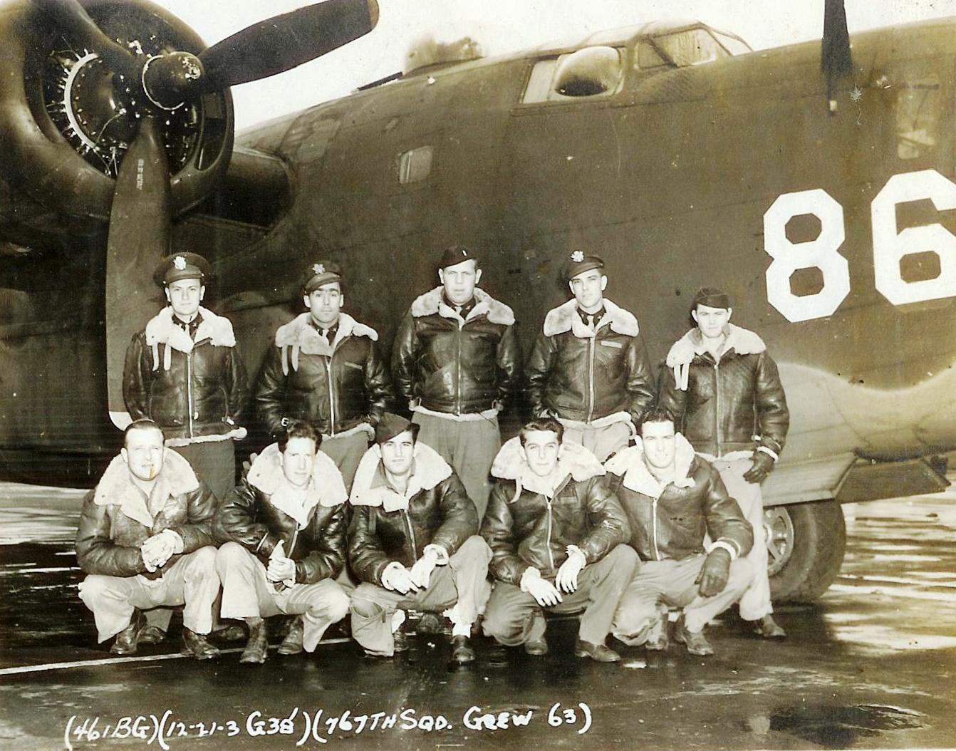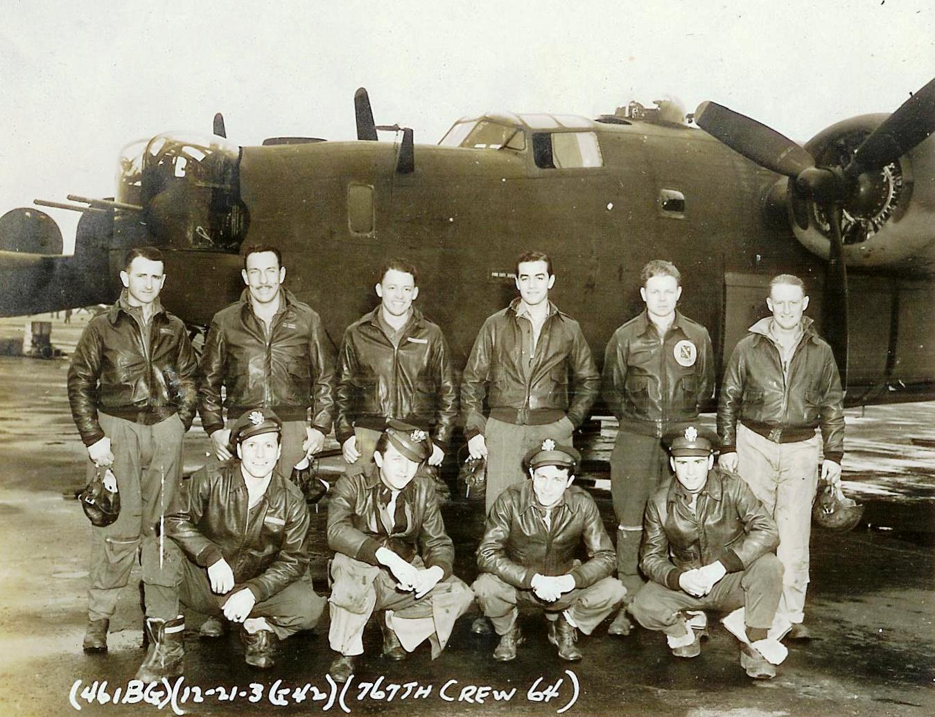 ![]() Crew #64 Standing L-R: S/Sgt. Harvey K. Holder (E & G); T/Sgt. Richard A. Carney (TG); Sgt. Walter G. Dial (BTG); S/Sgt. Hardy D. Brogoitti (RO & G); S/Sgt. Schiferwiller (WG); S/Sgt. Henry L. Schamel (NG) Squatting L-R: Lt. Harold B. Strong, Jr. (P); Lt. R. B. Evans (CP); Lt. Paul B. Sullivan, Jr. (N); Lt. Jack H. King (B) |
