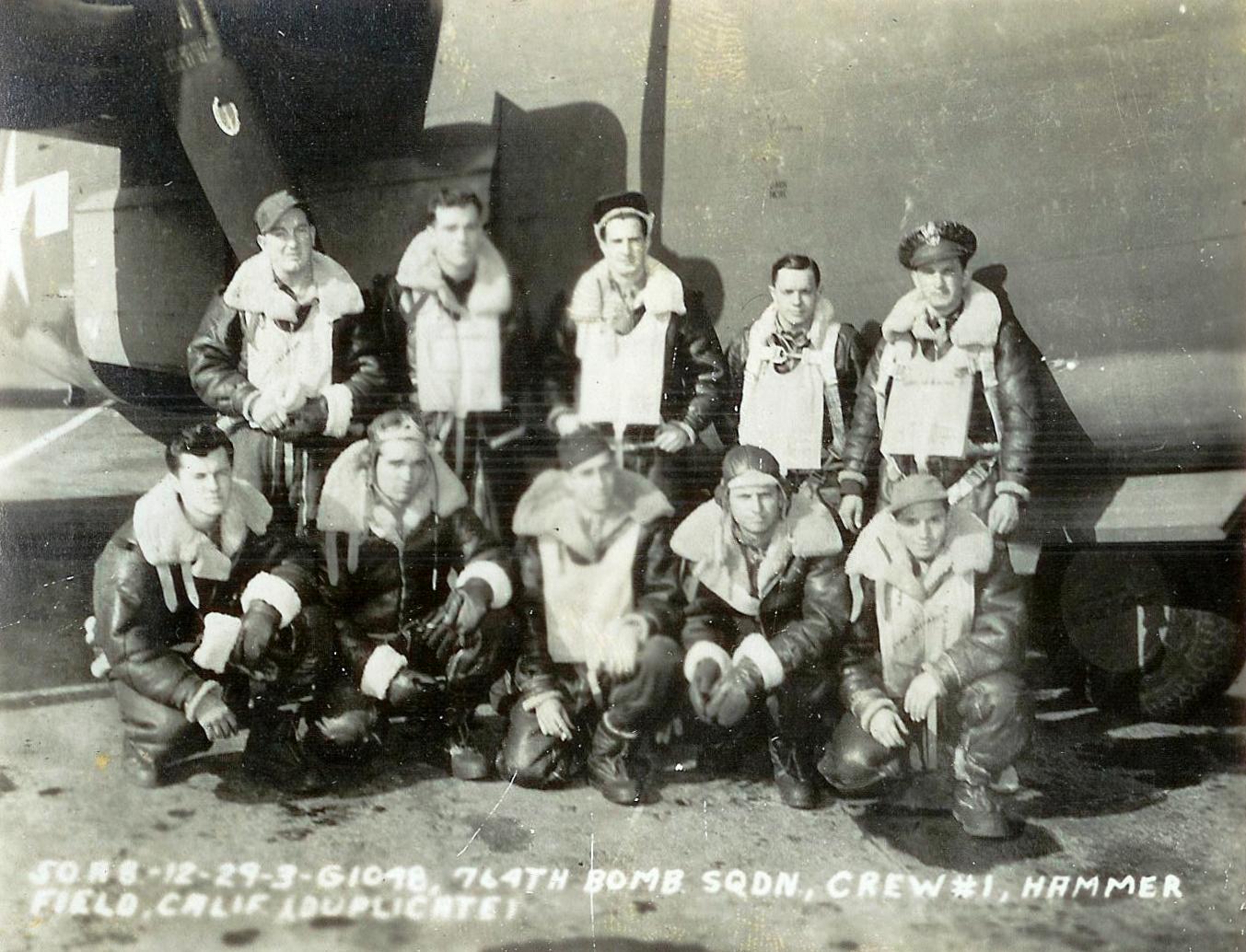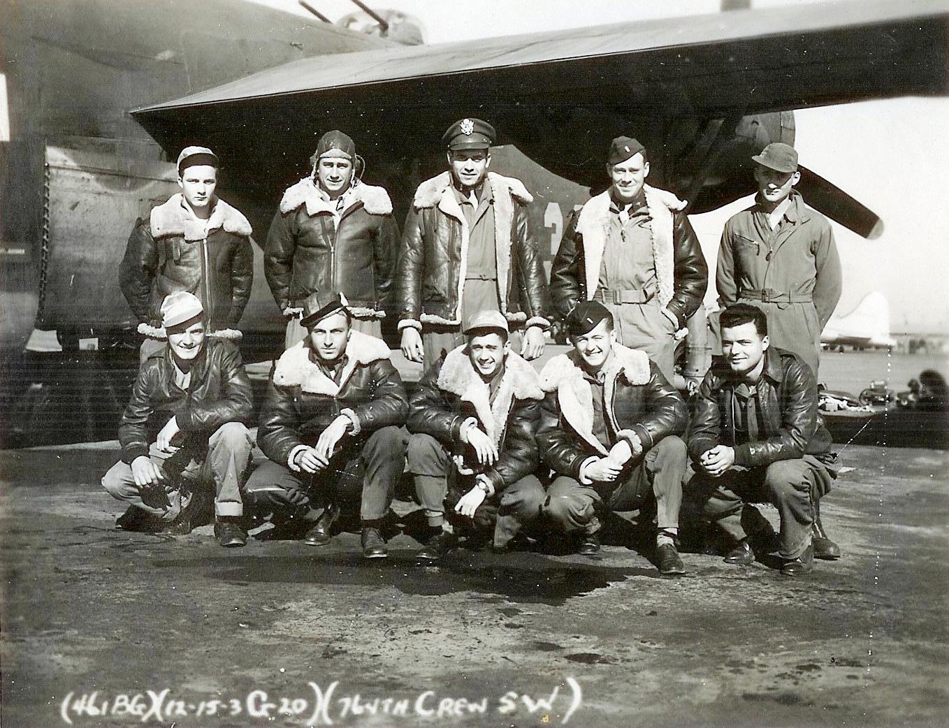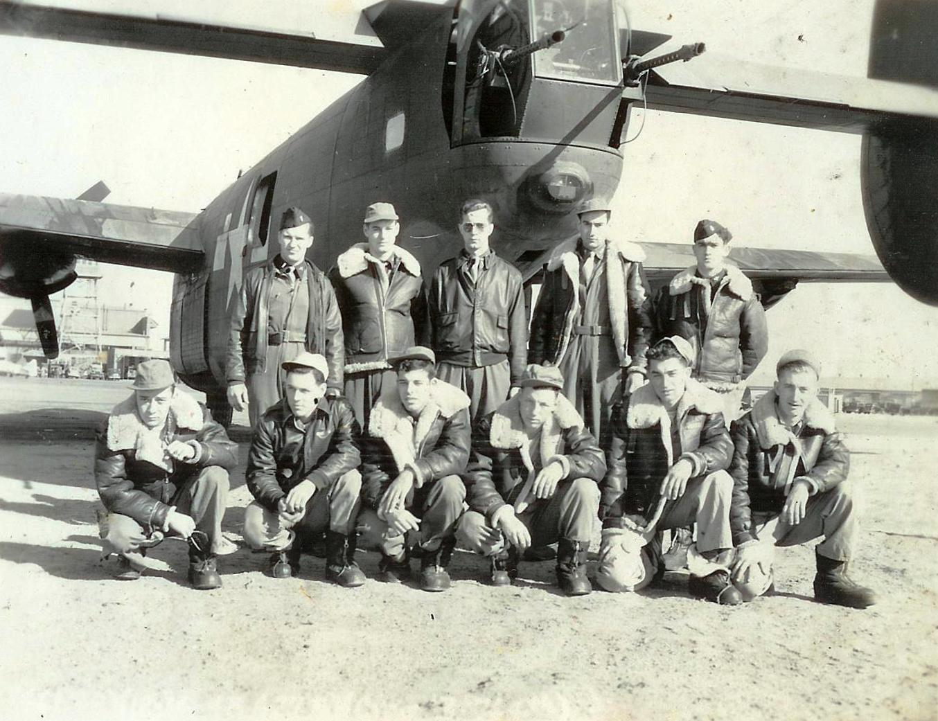 ![]() Crew #2 Standing L-R: Sgt. Frank N. Lamartini (E); Lt. Joseph J. Strumski (B); Lt. William Maxfield (N); Lt. Ralph L. Merrow (CP); Lt. Harold Blanchard (P) Squatting Rear L-R: Sgt. Ansel B. McNaight (RO); Sgt. Robert L. Jankovsky (TG); Sgt. Kenneth K. Kendle (NG); Sgt. Andrew D. Franklin (BTG); Sgt. Yancey L .Fulcher, Jr. (TTG) |
