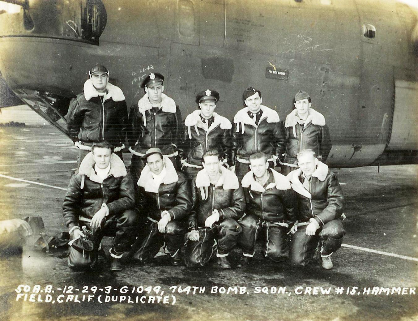 ![]() Crew #15 Standing L-R: Wilson, John F. 'Big John' (P); Nelle, Vernon C. 'VC' (B); Hoffman, Robert L. 'Little Bob' (CP) [KIA]; Brown, Robert S. (N) [W/M]; Perry, Paul M. (E/TT) Kneeling L-R: Schildt, Rich W. (WG); Bella, Paul J. (A/BG); Duckworth, E. Ray (RO/WG), Miszewski, Stanley 'Stan' (TG); Moore, Winfrey (E/NG) |