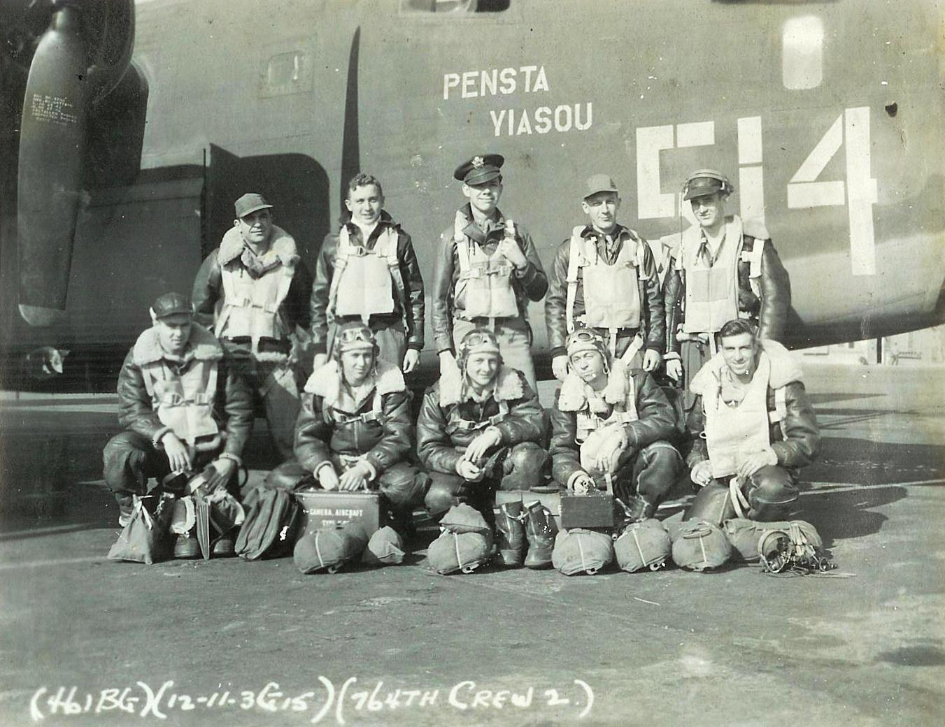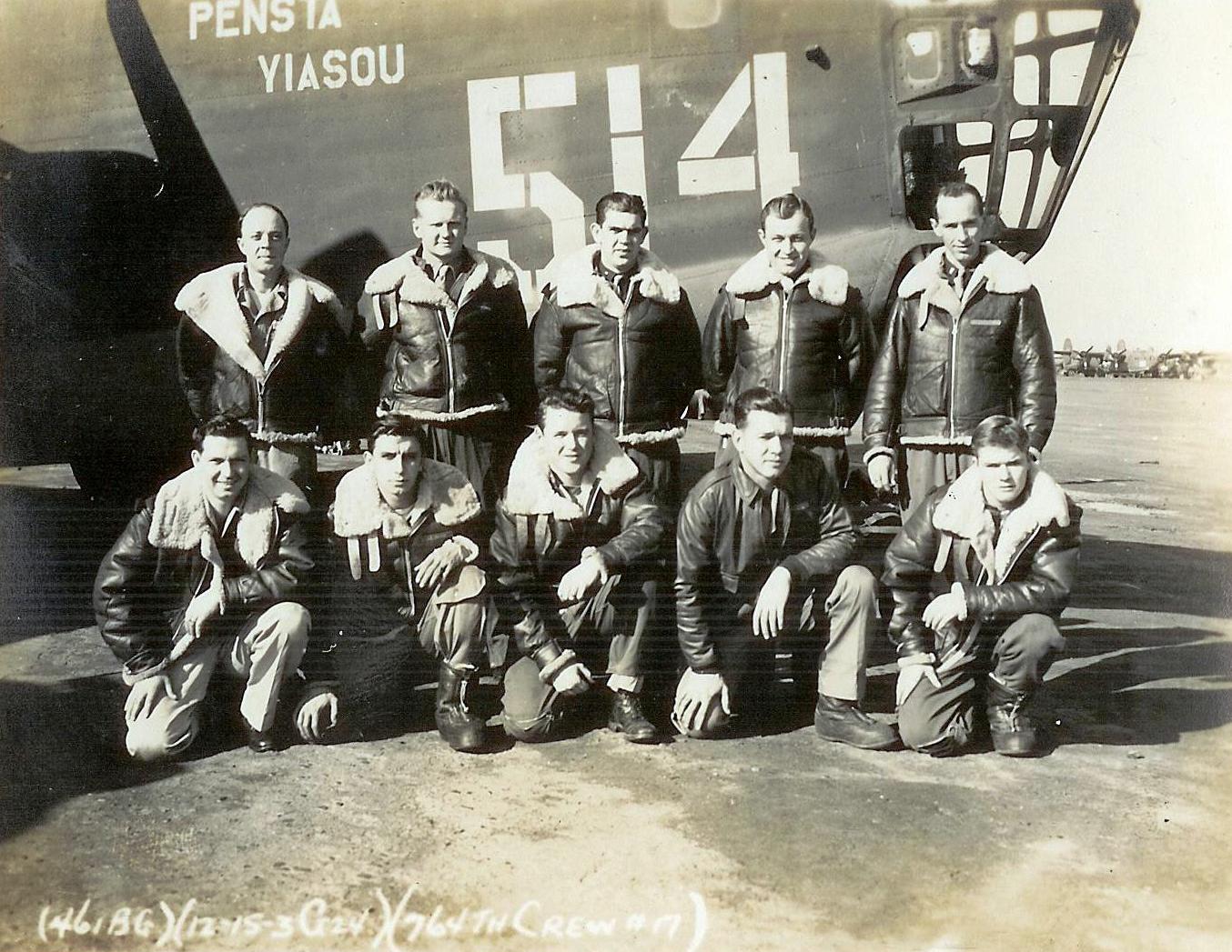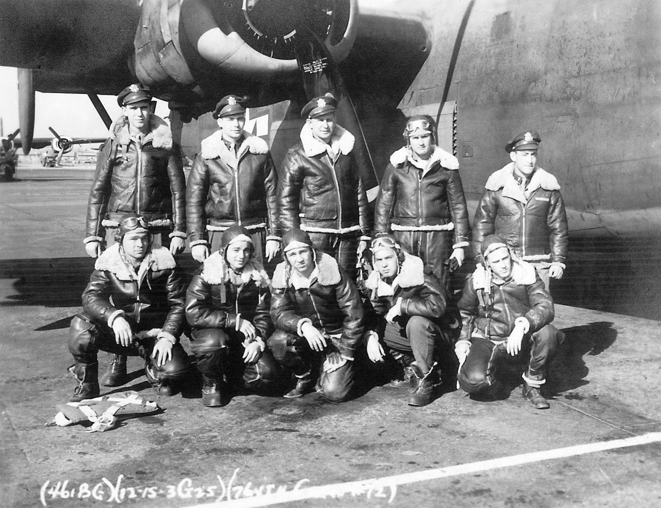 ![]() Lt. William C. Wallace (P) Lt. Henry S. Towne (CP) Lt. George A. Beedle (B) FO Oliver N. Auer (N) S/Sgt. Alfred H. Allen (E) Sgt. Joseph R. Baca (AR) S/Sgt. Antony M. Catalano (R) S/Sgt. Edward E. Cussen Sgt. Harry Chabin Sgt. Robert E. Hogan |