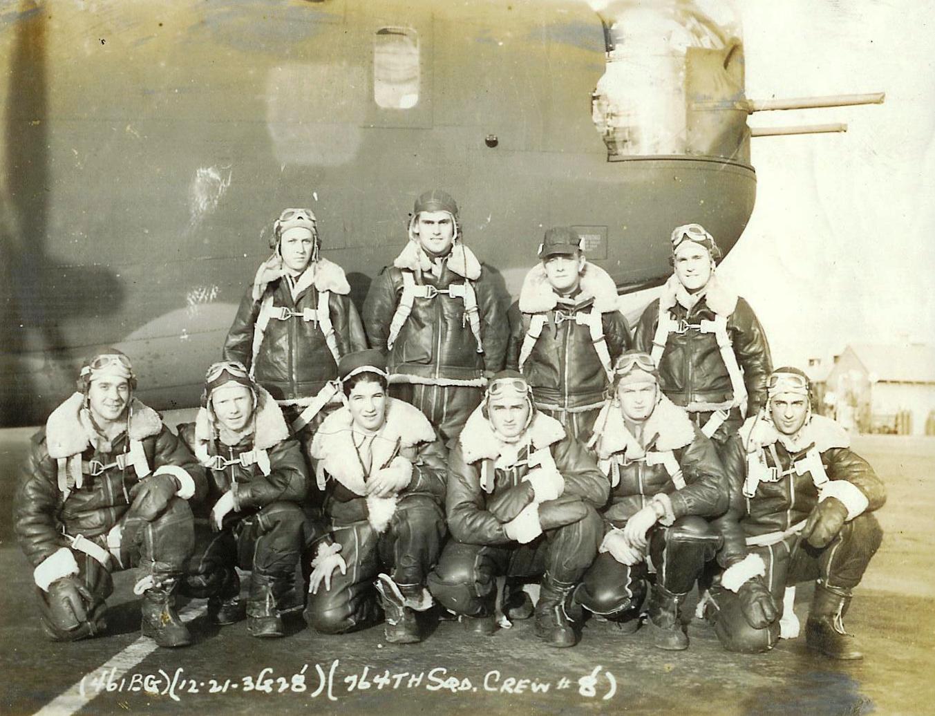 ![]() Crew #8 Standing L-R: Burton George A. (P); Fowler, Garvis O. (N); Egger, Roger D. (B); Veno, Vincent W. (CP) Kneeling L-R: Hassel, Luther C. (WG?); Brate, Benjamin H. (RO/WG?); Canino, Ralph R. (BG); Kingsley, Billy J. (WG?); Whitman, Robert L. (E/TT); Shipman, Floyd D. (TG) |