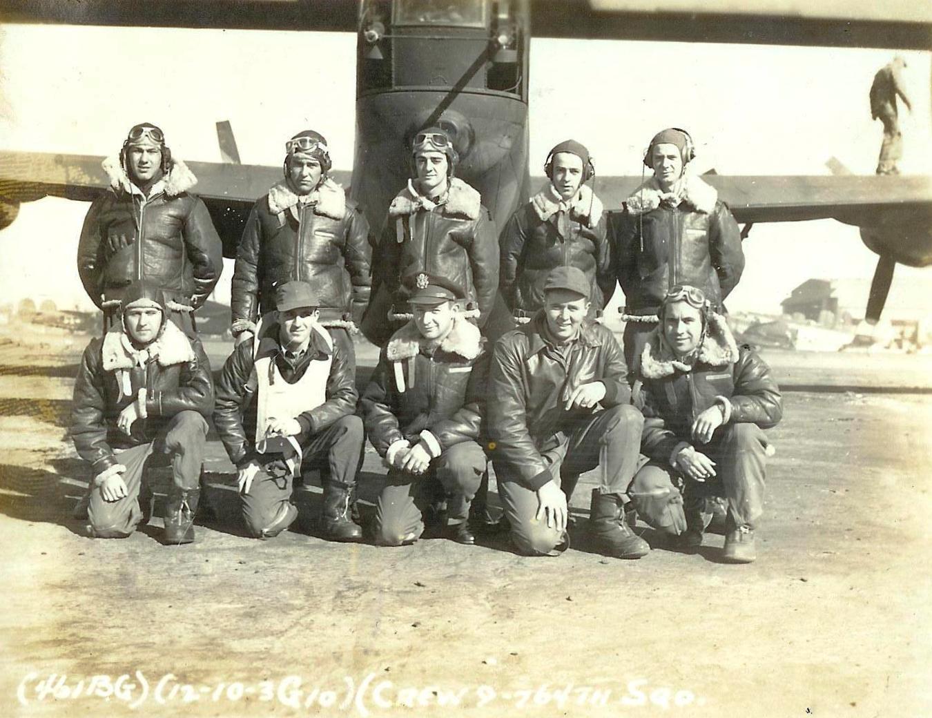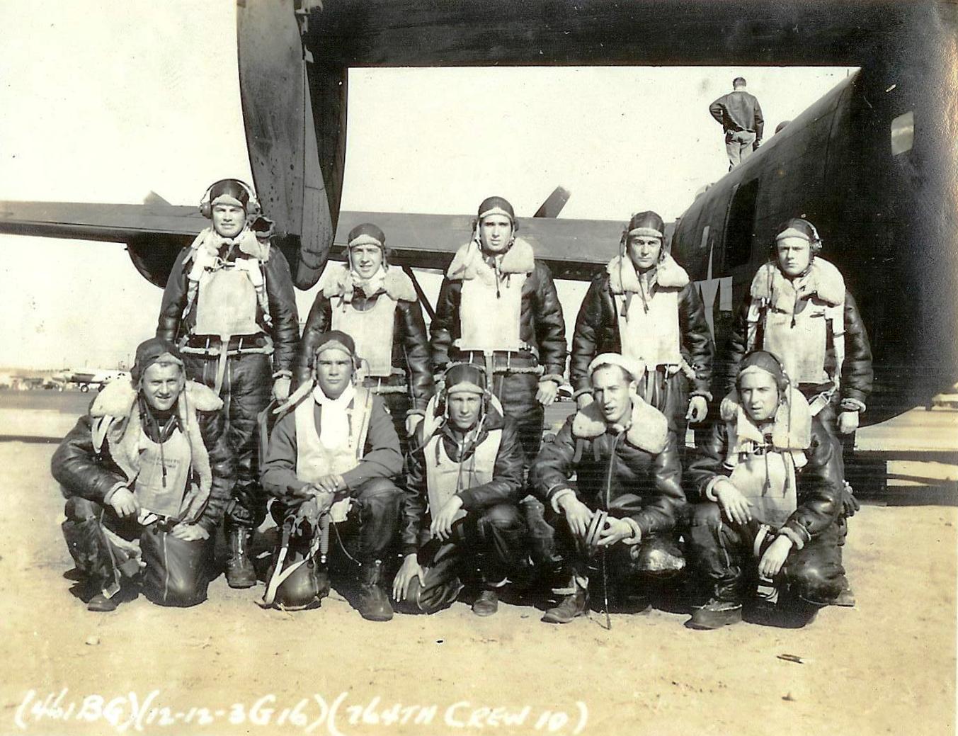 ![]() Crew #10 Standing L-R: Wastman, Vernon L. (P); O'Bannon, Jr., Frank C. (CP); Galloway, Walter J. (N); Doshan, Michael (B); Johnson, Donald C. (E/G) Kneeling L-R: Tibbets, Frank D. (RO/G); Donald Charland G. (TG); Arndt, Robert (TG); Rhode, Wilmer A. (BTG); McKinstry, Clyde A. (NG) |