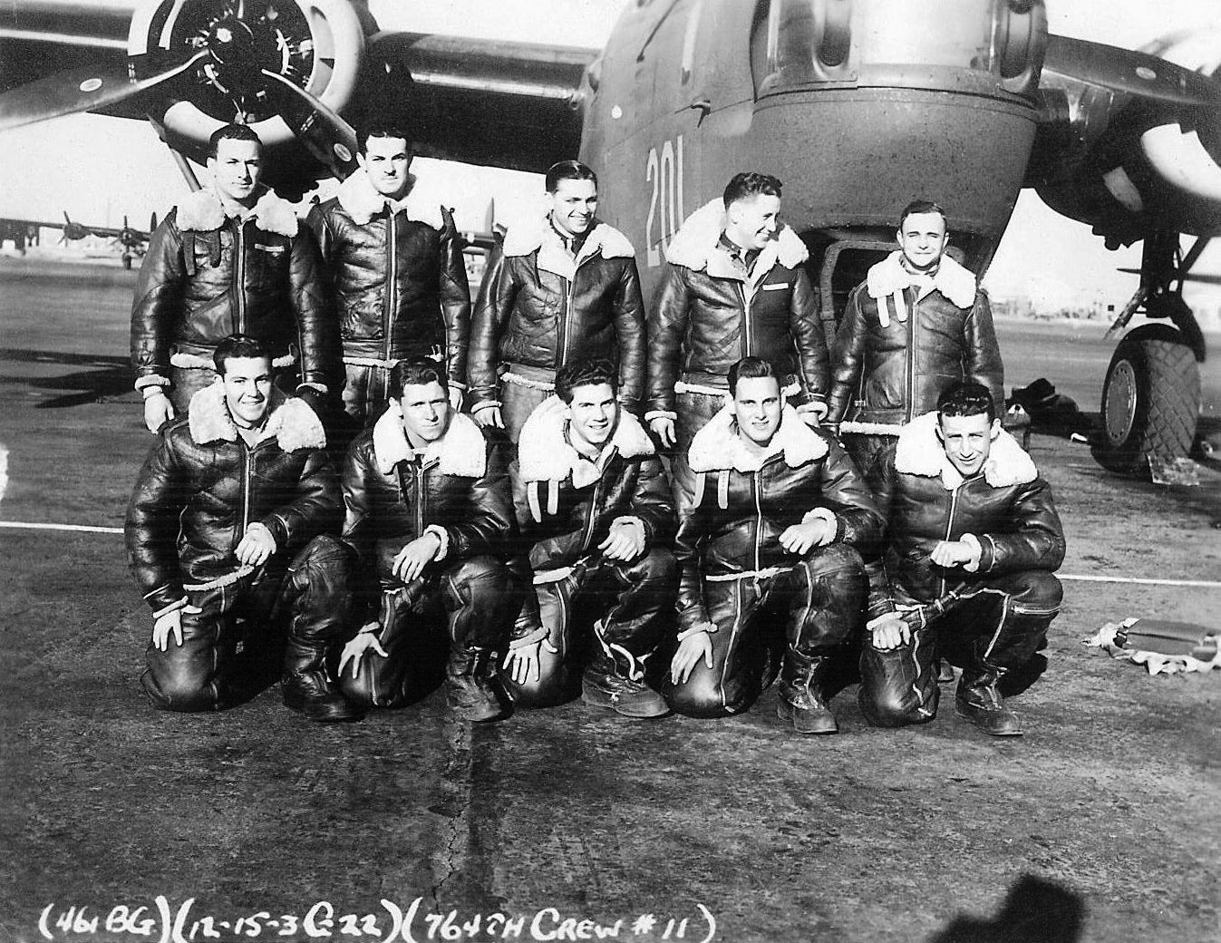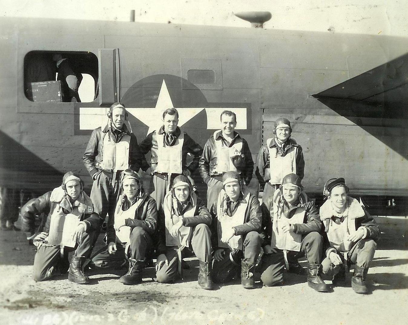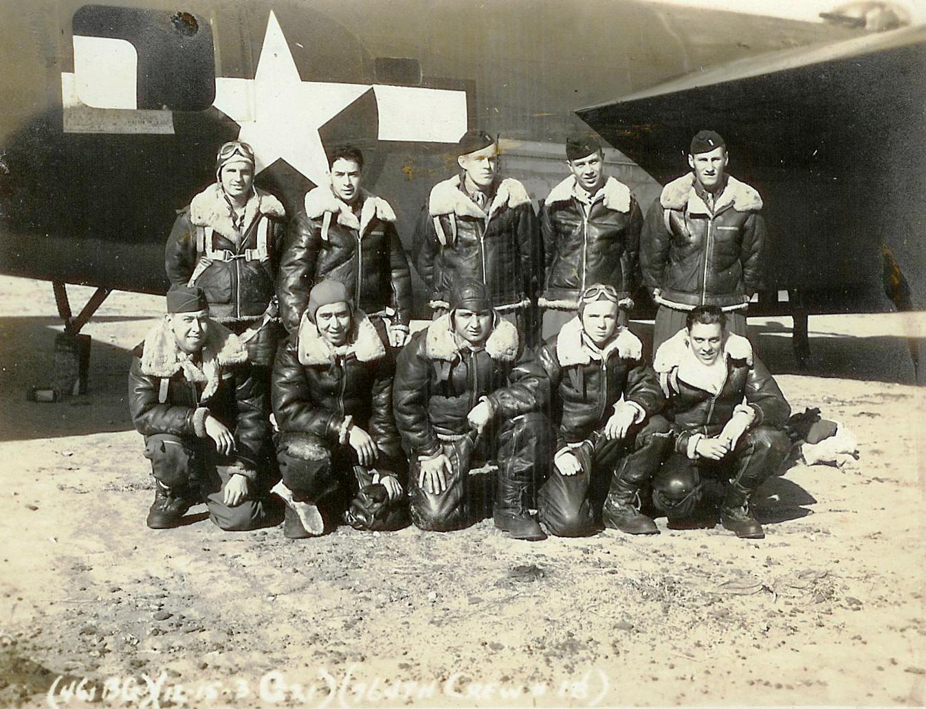 Enhanced by Gerry Kersey Crew #11 Standing L-R: Lt. William C. Wallace (P); Lt. Sam Minesberg (CP); FO Oliver N. Auer (N); Lt. George A. Beedle (B); S/Sgt. Alfred H. Allen (E) Kneeling L-R: Sgt. Joseph R. Baca (AR); Sgt. Harry Chabin; S/Sgt. Antony M. Catalano (R); Sgt. Robert E. Hogan; S/Sgt. Edward E. Cussen |