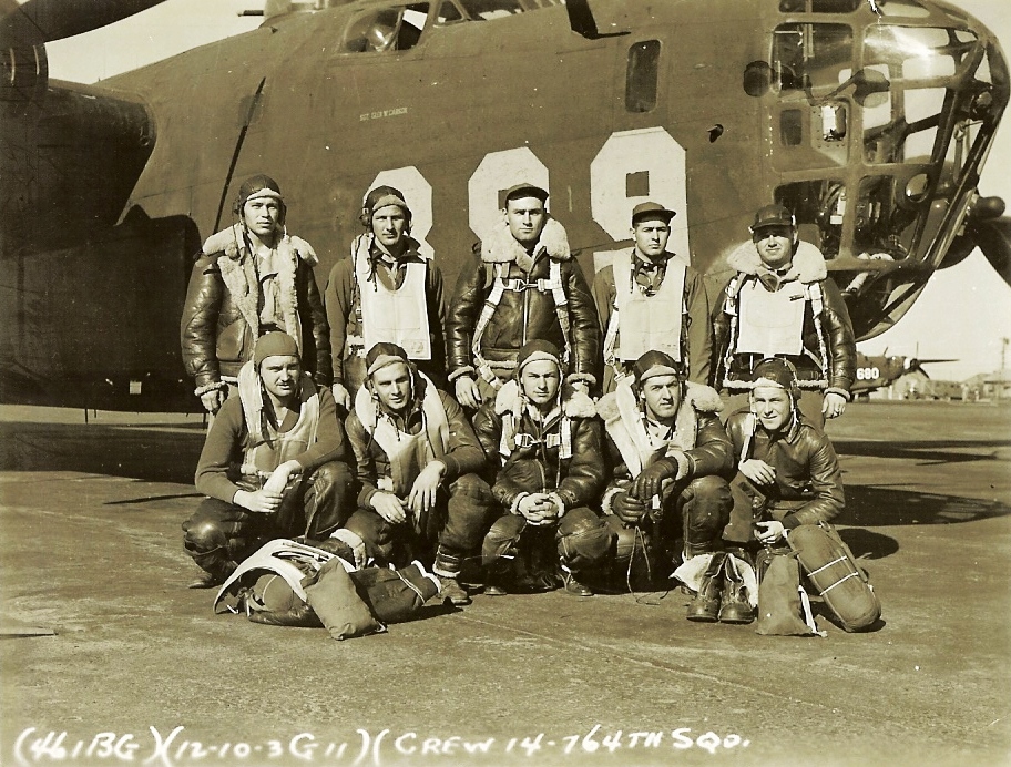 Crew #14 Standing L-R: S/Sgt. Richard A. Howenstine; Lt. Milton Grossberg; Lt. Robert W. White; Lt. Harold Q. Danford; Lt. James W. Benton Jr. Kneeling L-R: Pvt Patrick J. Donahue; Sgt. Charles E. Chambers; Sgt. Norman R. Meredith; Sgt. Martin Bruehl; Sgt. Norbert N. Gnoit |